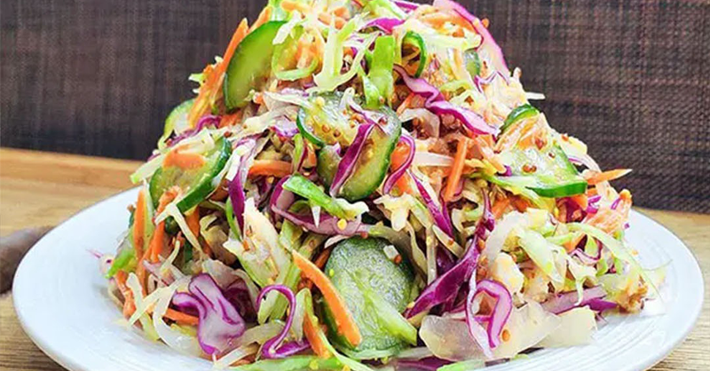 Crispy cabbage salad topped with a dressing that is both sweet and sour