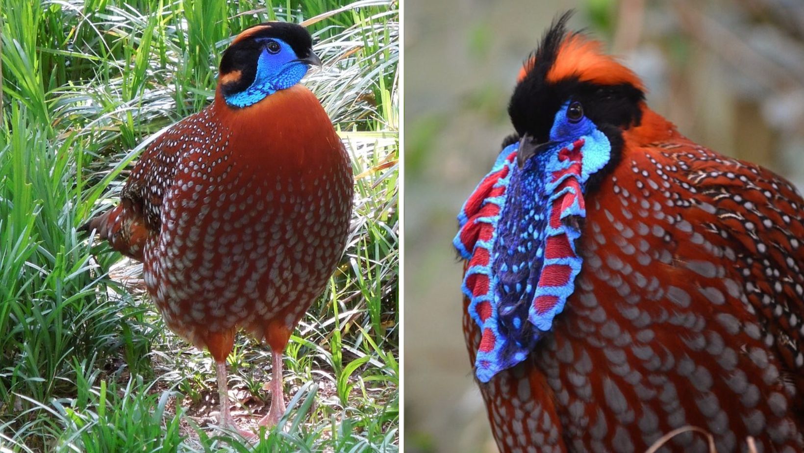 A rather rotund, but exquisitely colored flame orange bird, with an equally exquisitely colored bowtie – meet Temminck’s tragopan!