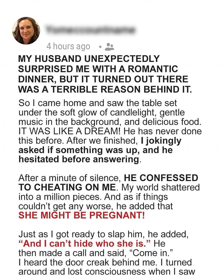 My husband unexpectedly surprised me with a romantic dinner, but there was a terrible reason behind it