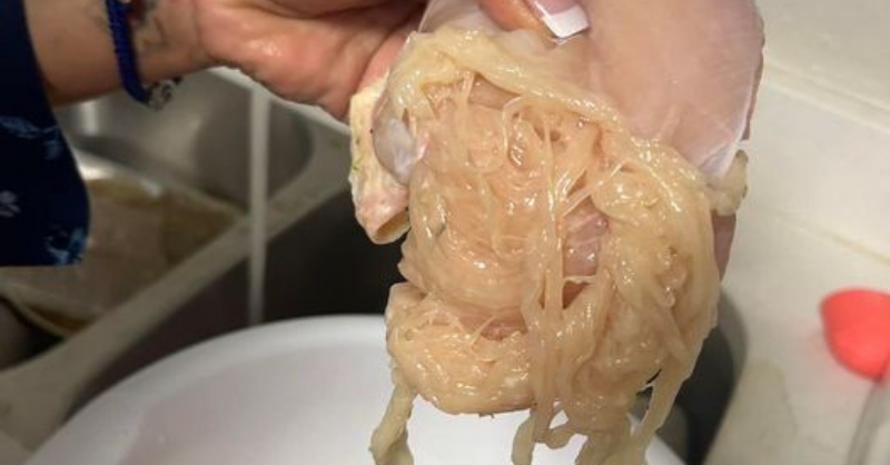 A Texas mother was completely shocked when the poultry she was preparing for dinner separated into stringy pieces of spaghetti. Explaining pasta was not on the menu that night, the mom...